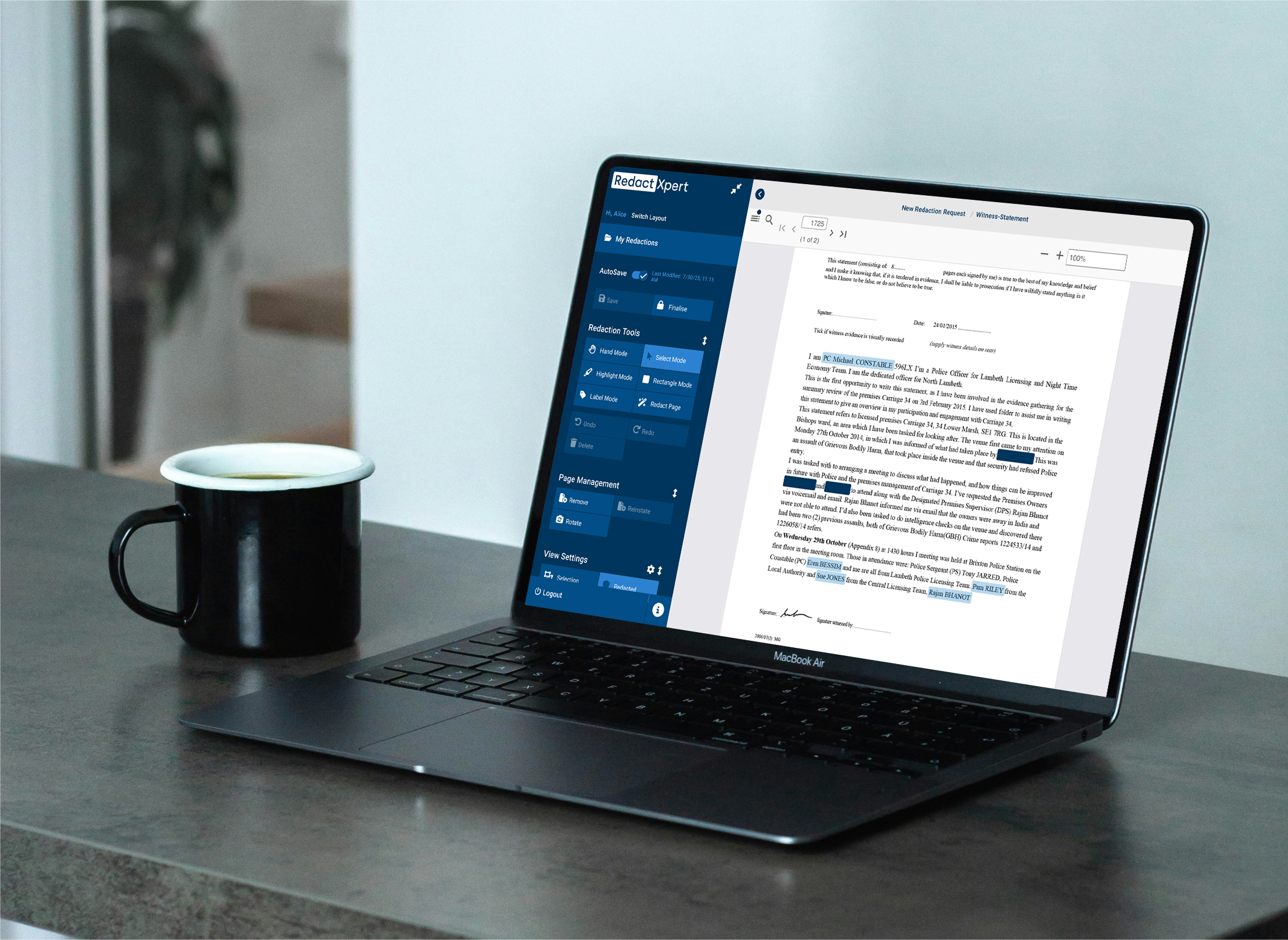 Designed with input from UK police forces to streamline the redaction of police documents for the Crown Prosecution Service.